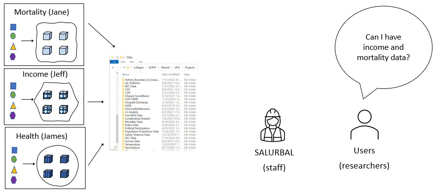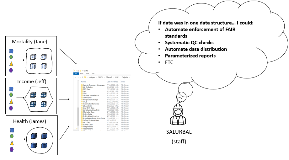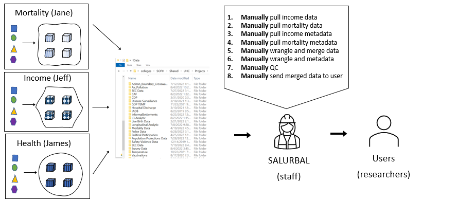 - Lack of strict standards across groups: variable naming conventions, codebook content/format